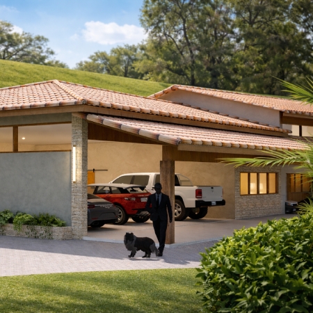 Implantada em um terreno com área verde e espelho d’água natural, a residência se desenvolve em um único pavimento, favorecendo a fluidez dos espaços e a conexão direta com o exterior.
