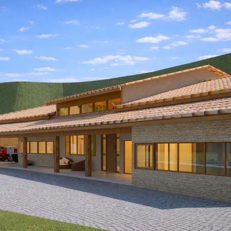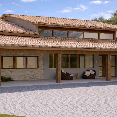 A composição volumétrica é marcada por telhados inclinados com telha cerâmica, amplos beirais e estrutura em madeira aparente, reforçando o caráter acolhedor e atemporal da proposta.