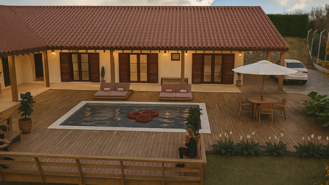 Um presente especial: esse projeto nasceu do desejo de um filho em materializar o sonho dos pais — a casa de campo idealizada há anos. Com a planta já definida, nosso papel foi dar forma a essa ideia através de imagens e detalhamento técnico, transformando a memória afetiva em realidade.