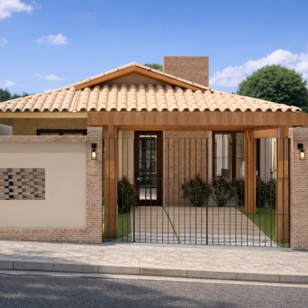 A composição frontal combina tijolo aparente, madeira estrutural e telha cerâmica, reforçando uma linguagem rústica contemporânea, atemporal e acolhedora.
