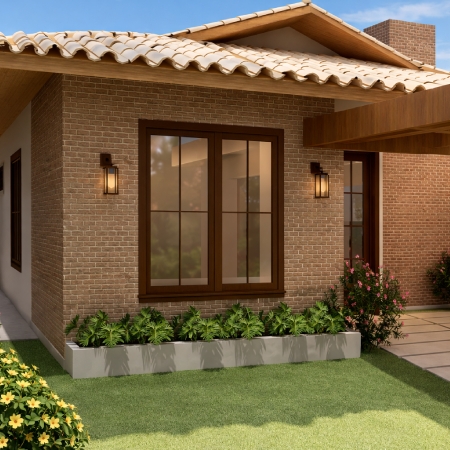 A cobertura com beirais generosos contribui para proteção solar e conforto térmico. As aberturas foram estrategicamente posicionadas para favorecer iluminação e ventilação natural.
